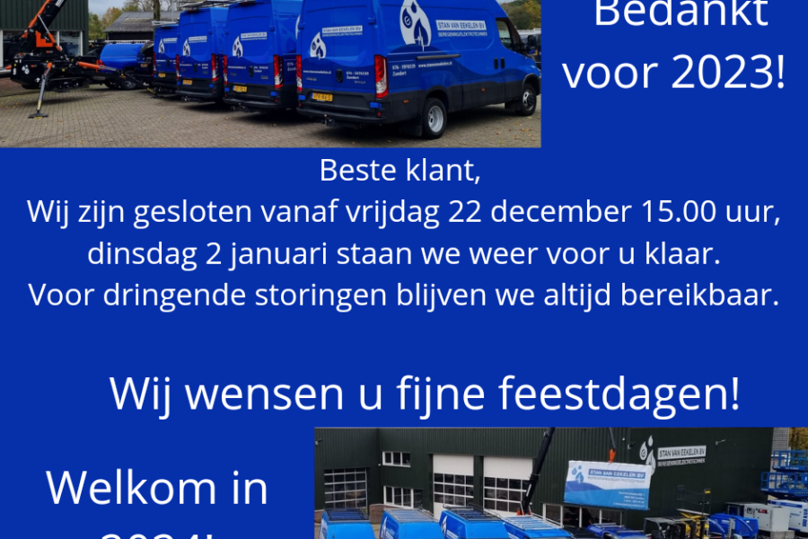 Nieuws Aangepaste openingstijden rondom feestdagen Beste klant, Wij zijn gesloten vanaf vrijdag 22 december 15.00 uur. Dinsdag 2 januari staan…Arno van Eekelen16 december 2023
